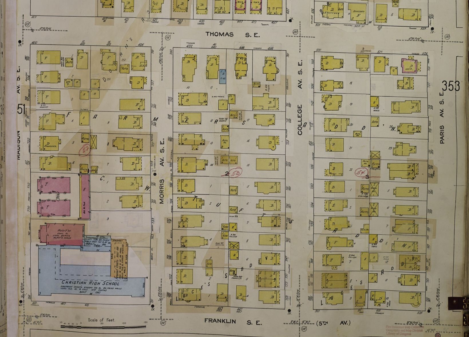 The Sanborn map below shows the school in the late 1940s–the blue, red, and yellow building complex featuring a new facility completed in 1947, according to the map.