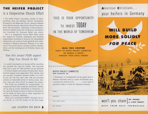 Many other ships found new purpose serving humanitarian causes. Millions of people across the world were in desperate need of food and support. To ameliorate this need, an Anabaptist denomination, the Church of the Brethren, partnered with the United Nations Relief and Rehabilitation Administration (UNRRA) on a “Heifer Project.”