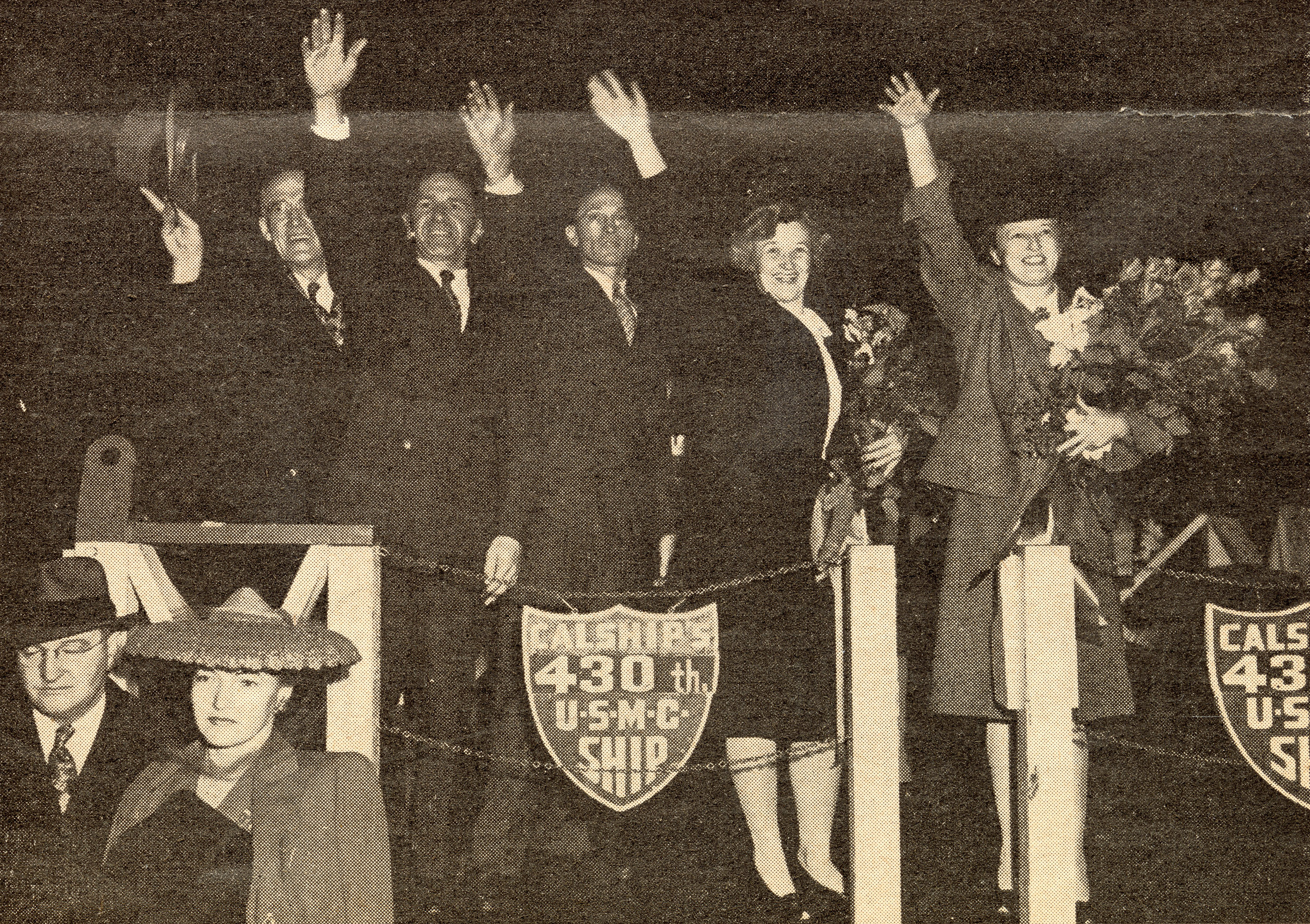The day before, in the afternoon, Calvin alumni and friends in the area gathered at Second Christian Reformed Church in Bellflower where they had coffee and collected funds to contribute to the ship’s library. They then left for Terminal Island, arriving around 1:00 AM Wednesday morning. There they once again had coffee at a brief reception hosted by the company before ceremonies began at 1:45.